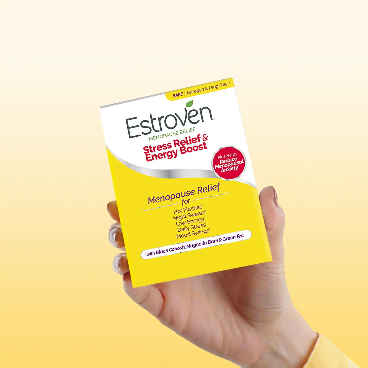 On top of hot flashes and night sweats, menopause can come with unpredictable symptoms like feeling more stressed and irritable. Estroven® Menopause Relief Stress Relief & Energy Boost is made with naturally sourced ingredients such as Black Cohosh to help with hot flashes and night sweats, Magnolia Bark for managing stress, and Green Tea and Yerba Maté extracts to boost energy and manage fatigue.*